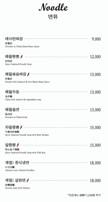 * 포장메뉴 "곱빼기"는 2,000원 추가입니다.