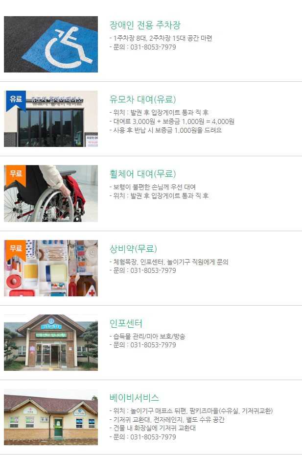안성팜랜드에는 넓은 주차장을 보유하고 있어서, 주차 걱정은 하지 않아도 됩니다. 또한 애기들에게는 유모차를 대여해주기도 하며, 거동이 불편한 어르신들에겐 무료로 휠체어도 대여를 하고 있어 편리하게 방문하실 수 있습니다. 또한 팜랜드 내에서도 전기자동차를 통해 편하게 안성팜랜드를 구경하실 수 있습니다.