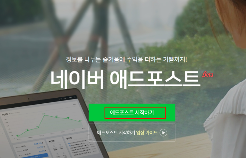 - 네이버 애드포스트 홈페이지(https://adpost.naver.com/)에 접속하여 "시작하기" 버튼 클릭