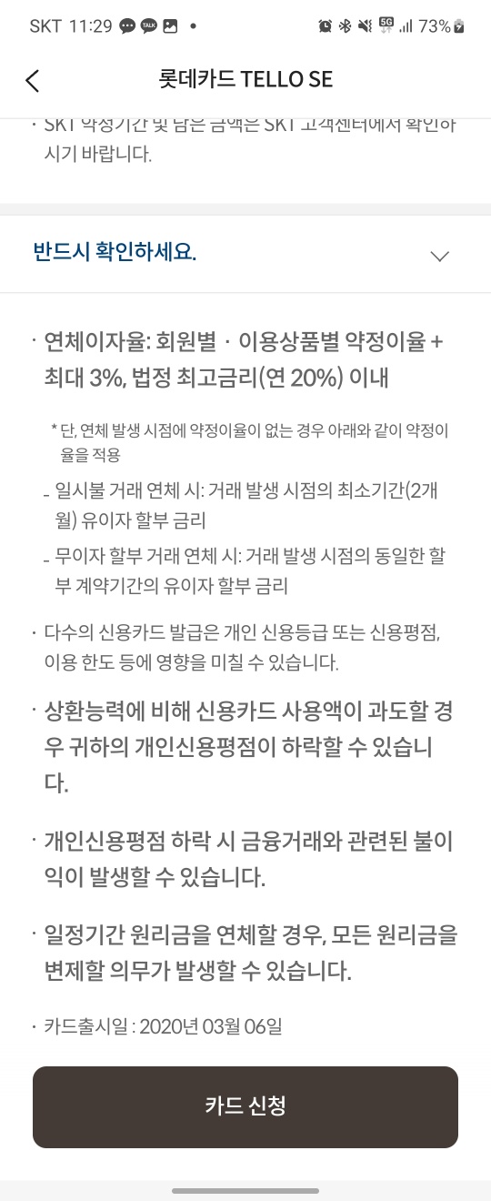 롯데카드 어플을 통해 가입하는 방법에 대해 설명해 드리겠습니다. 롯데카드 어플에서 TELLO SE 카드를 검색하면, 쉽게 가입이 가능합니다. 연회비는 25,000원이 발생하는 카드라, MASTER카드로 만들어서 해외에서도 결재가 가능하도록 하면 좋을 것 같습니다. 또한 후불교통카드도 가능하여, 대중교통을 이용하시는 분들 자주 이용하실 수 있을 것 같습니다. 금방 실적을 채워서 많은 할인을 받으시면 좋을 것 같습니다.