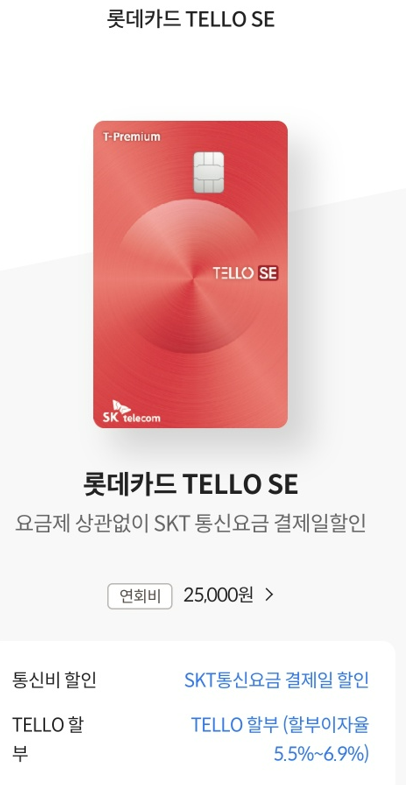롯데카드 TELLO SE 카드 혜택으로는 통신비 할인과 TELLO 할부 해택이 있습니다. 통신비 할인으로는 SKT 통신요금 결제일 할인이 있습니다. TELLO 할부는 TELLO SKT 할부(할부이자 5.5% ~ 6.9%)가 있습니다.