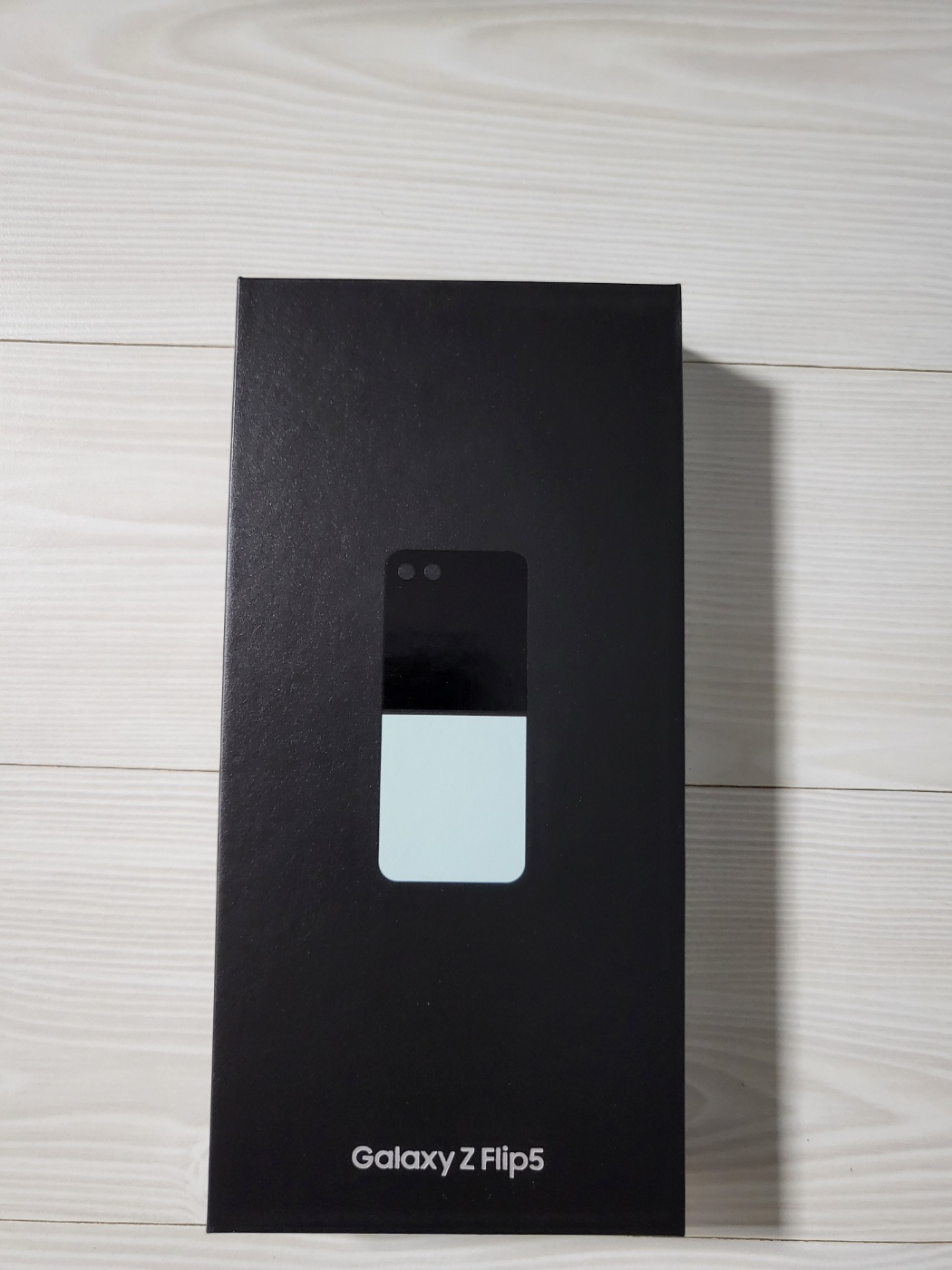 갤럭시 z플립5 민트 색상으로 구매했습니다. 사전예약으로 받은 핸드폰이며 포장을 뜯기 전에 앞, 뒤, 옆모습을 찍어봤습니다.