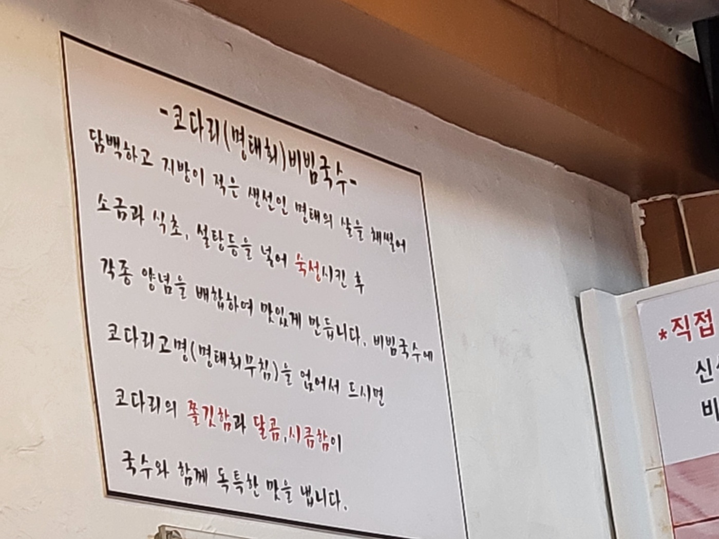 담백하고 지방이 적은 생선인 명태의 살을 채 썰어 소금과 식초, 설탕등을 넣어 숙성시킨 후 각종 양념을 배합하여 맛있게 만듭니다. 비빔국수에 코다리고명(명태회무침)을 얹어서 드시면 코다리의 쫄깃함과 달콤, 시큼함이 국수와 함께 독특한 맛을 냅니다.