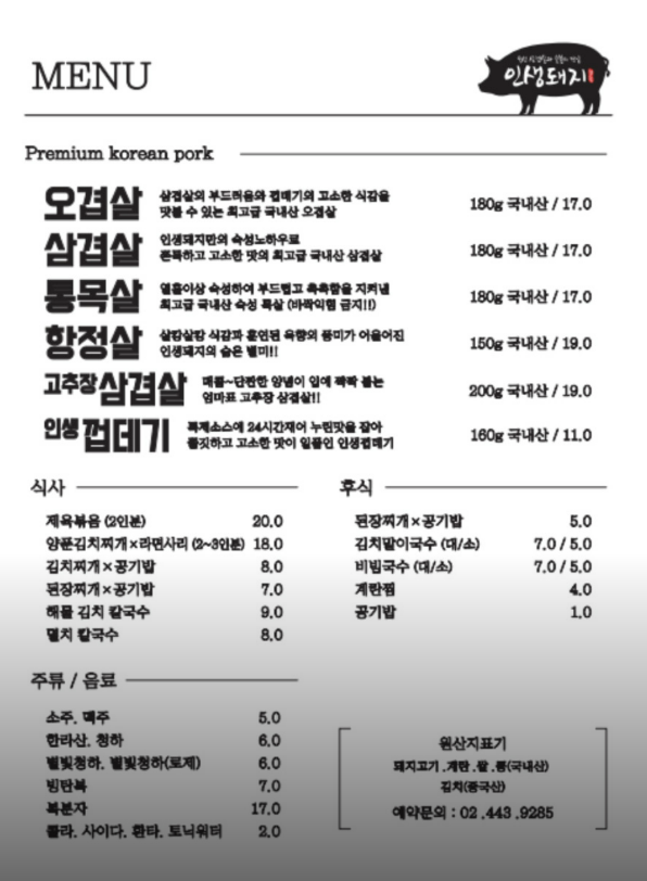 인생돼지 송파본점 방문하여 삼겹살과 통목살을 먹었는데, 냄새도 없이 맛이 좋았습니다. 금액도 합리적인 금액이었고 고기와 같이 곁들일 수 있는 다양한 찌개류들도 많았으며, 국수나 계란찜도 있어서 같이 먹기 좋았습니다. 방문했을떄도 사람이 많았고, 계속해서 손님들이 들어와서 금방 만석이 되었습니다. 그만큼 만집임을 알 수 있었고, 인생돼지를 방문하실 계획이 있으신 분들이라면, 보다 일찍 방문해주시는게 좋을 것 같습니다.