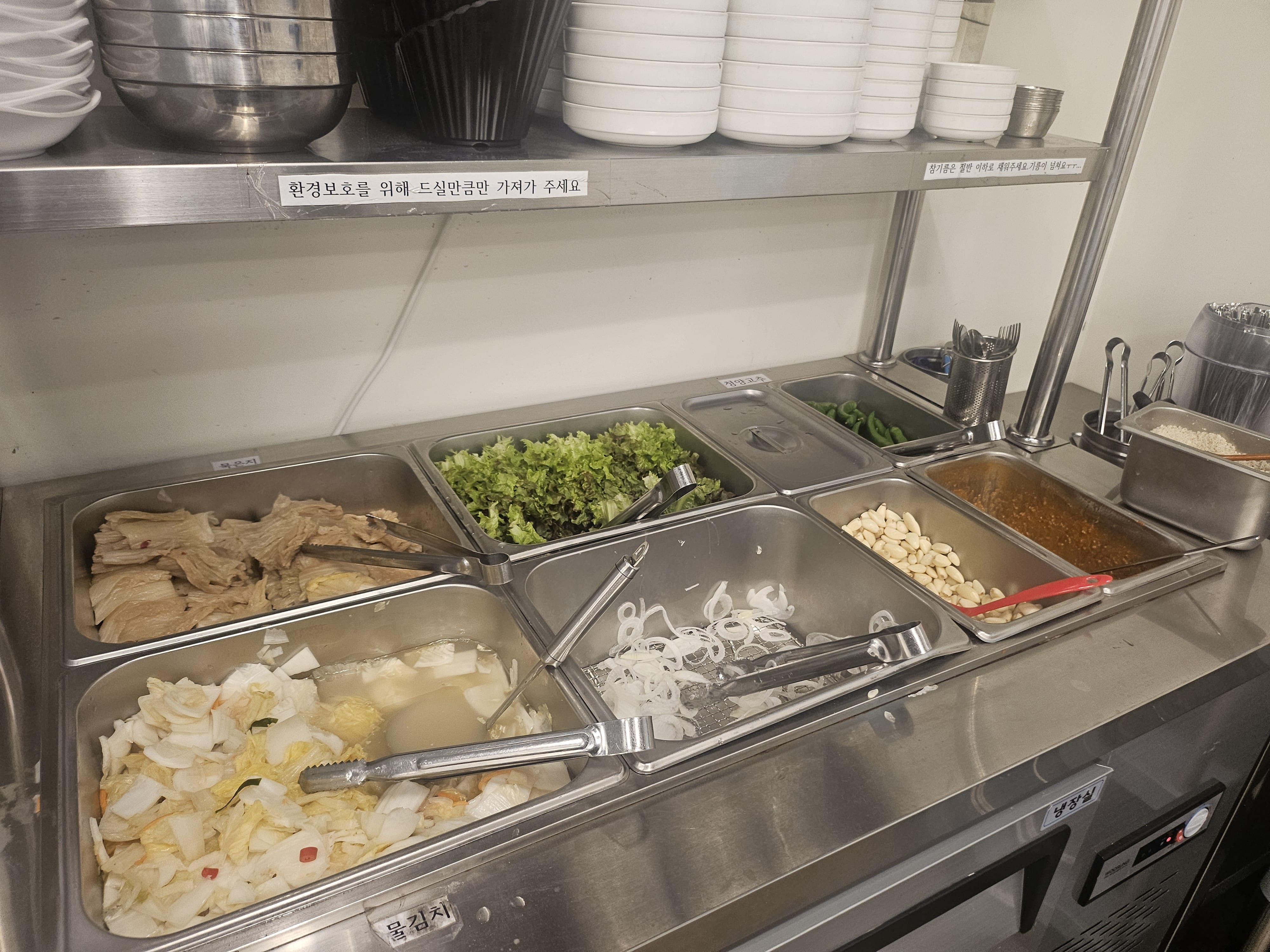 셀프바가 있어서 부족한 기본 반찬에 대해서는 편하게 리필할 수 있습니다. 묵은지, 배추절임, 양파, 마늘, 상추까지 편하게 셀프바 이용이 가능합니다. 오늘도 방문해 주셔서 감사합니다. 좋은 하루 보내세요.