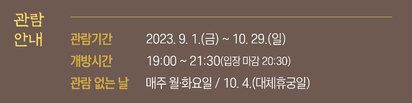 관람시간 : 19:00 ~ 21:30 ( 20:30 입장 마감)