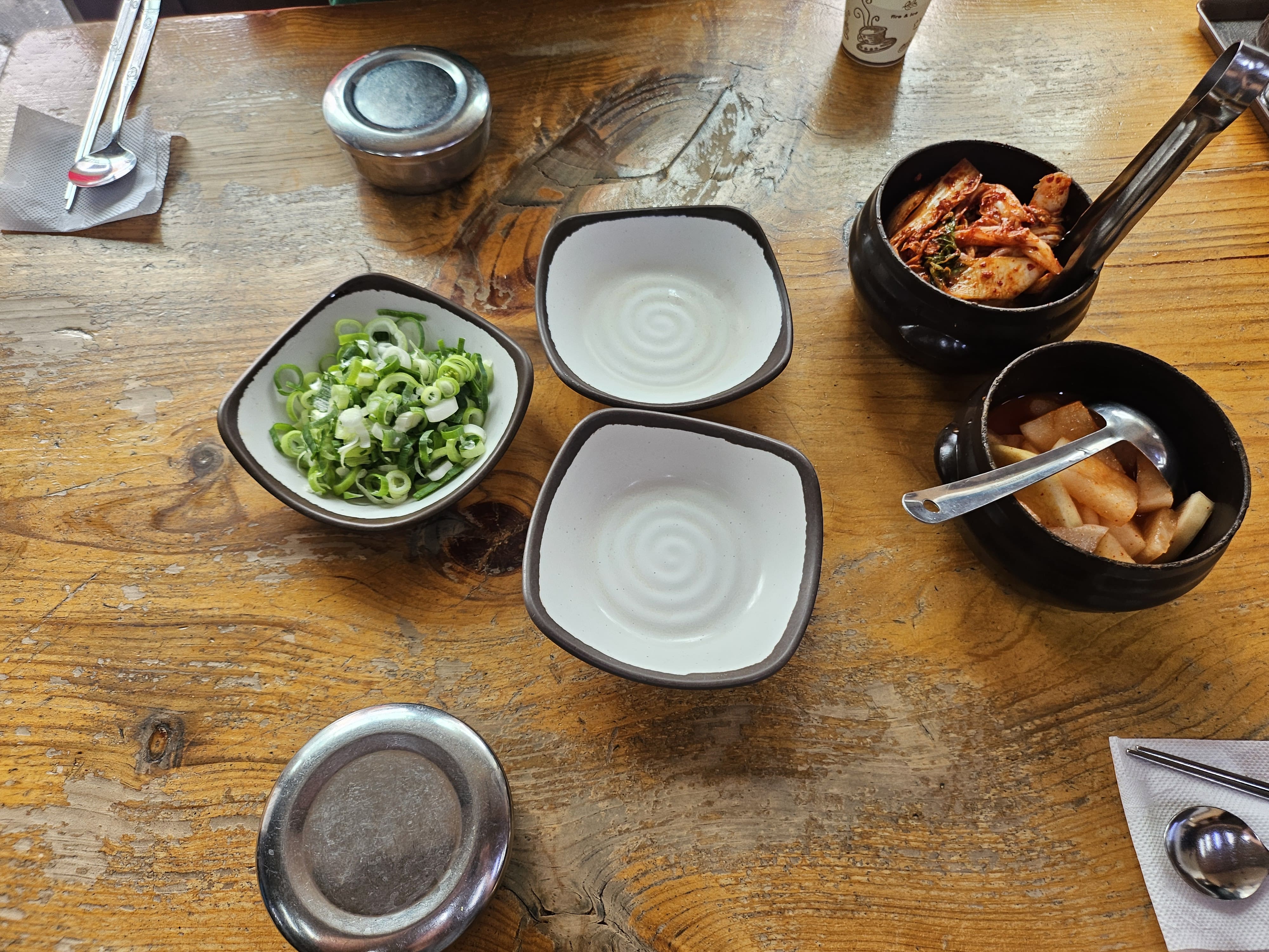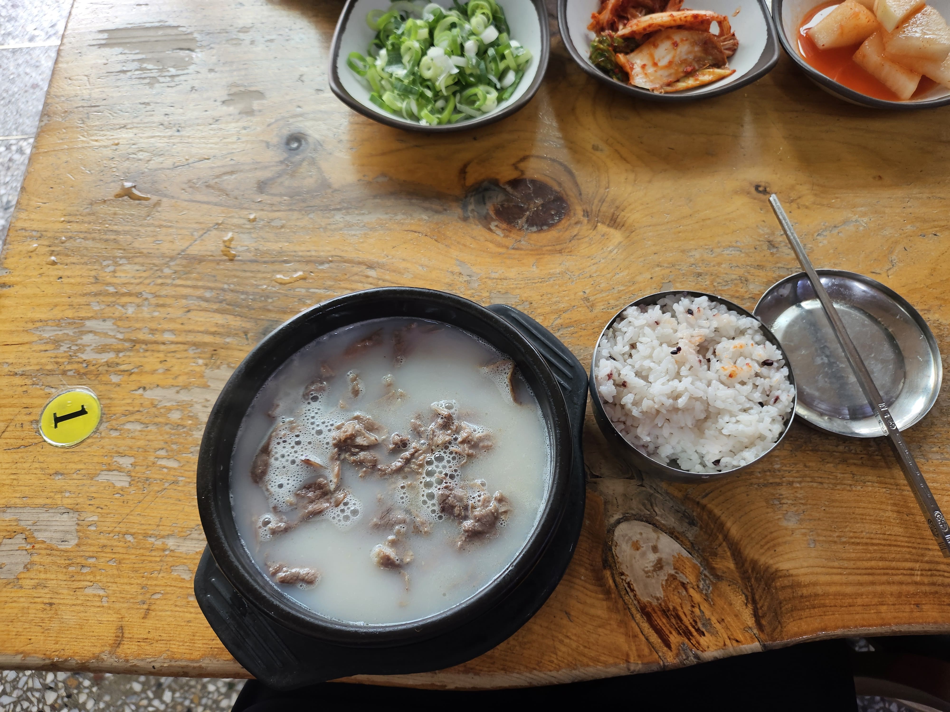 기본적으로 사골국물과 소면 그리고 고기가 들어가 있습니다. 취향것 대파와 후추가루 그리고 소금으로 간을 해서 먹으면 됩니다.