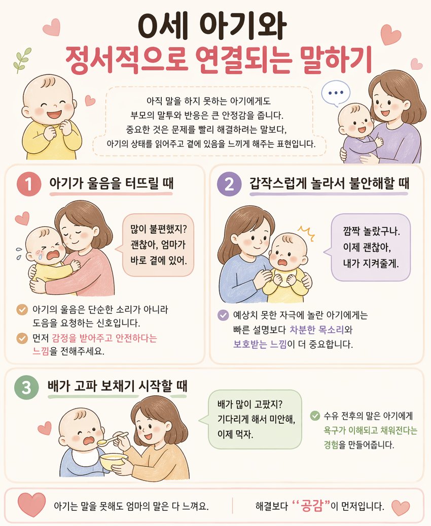 중요한 것은 문제를 빨리 해결하려는 말보다, 아기의 상태를 읽어주고 곁에 있음을 느끼게 해주는 표현입니다.