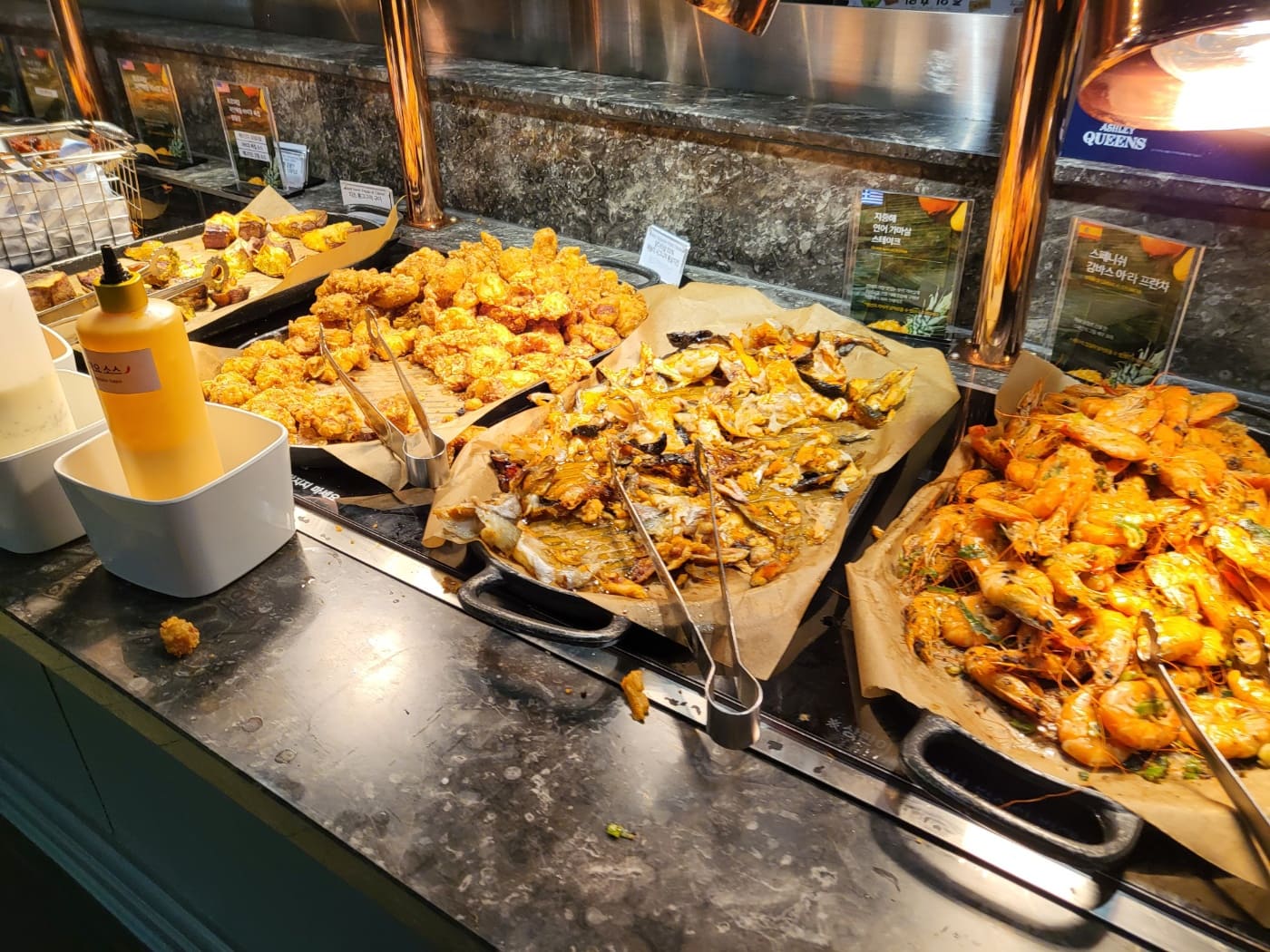 대파구이, 싱가포르 리얼 칠리 크랩, 하와이안 파인애플 피자, 고르곤졸라 피자, 마르게리따 피자, 알마이스 피자, 어니언 크런치 멕시칸 타코 포크, 파인애플 바베큐 폭립, 치즈 통고구마 구이, 애슐리 시그니처 통살치킨, 스페니쉬 감바스 아라 프란차, 지중해 연어 가마살 스테이크, 뚝배기 누릉지 파스타, 까느보나라 파스타, 시푸드 로제 파스타, 알리오 올리오, 로제 크림 떡볶이가 있었습니다. 양도 정말 많고, 보기에도 먹음직스러워 아주 좋았습니다.
