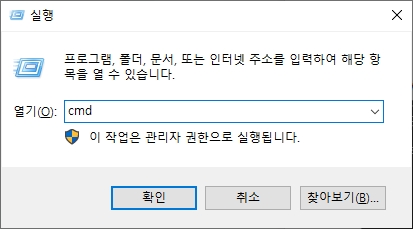 2. 실행창을 열어(단축키 : 윈도우키+R) cmd를 입력하여 명령 프롬프트를 실행한다.