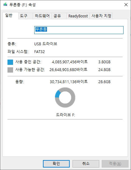 1. 파일 시스템(FAT32)과 변환하고자 하는 드라이브 경로(F:)를 확인한다.