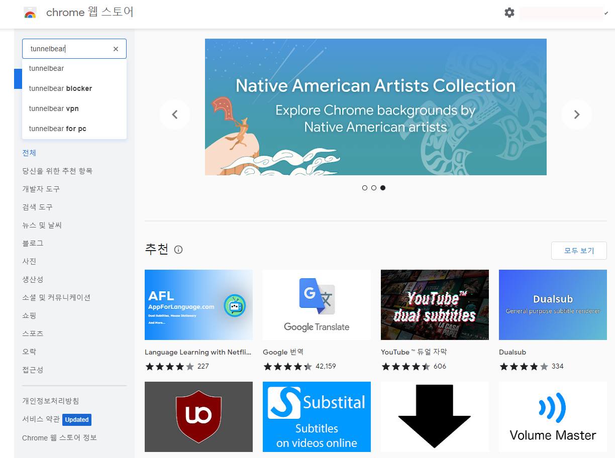2. 확장 프로그램에서 TUNNEL BEAR를 검색해 주세요.