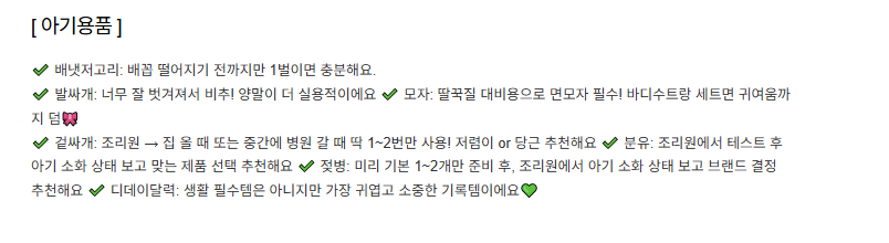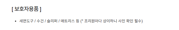 - 세면도구 / 수건 / 슬리퍼 / 매트리스 등 (* 조리원마다 상이하니 사전 확인 필수)