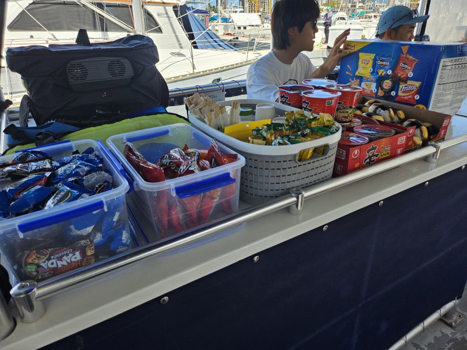 배에는 다양한 간식과 라면, 무스비가 있어서 스노쿨링하면서 배고플 때 간식을 먹을 수 있어서 좋았습니다. 다양한 초콜릿 과자도 있고 도리토스도 있고 수영 후에 먹는 무스비랑 신라면은 정말 맛있었습니다.