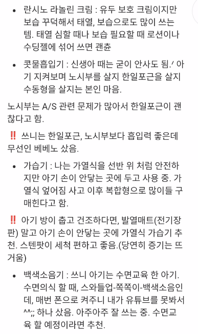- 콧물흡입기 : 신생아 때는 굳이 안사도 됨.ᐟ 아기 지켜보며 노시부를 살지 한일포근을 살지 수동형을 살지는 본인 마음.