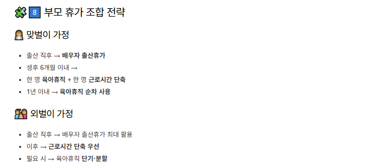 - 출산 직후 → 배우자 출산휴가 최대 활용