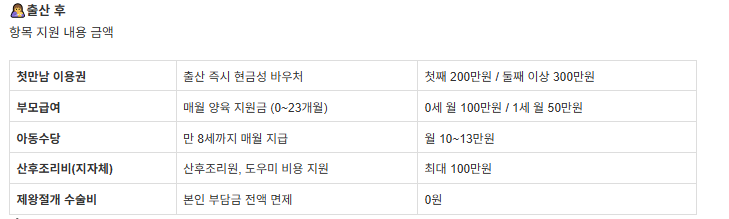 | 첫만남 이용권 | 출산 즉시 현금성 바우처 | 첫째 200만원 / 둘째 이상 300만원 |