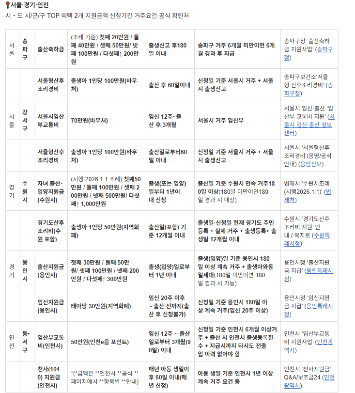 | 경기 | 수원시 | 자녀 출산·입양지원금(수원시) | (시행 2026.1.1 조례) 첫째50만원 / 둘째 100만원 / 셋째 200만원 / 넷째 500만원/ 다섯째↑ 1,000만원 | 출생(또는 입양)일부터 1년이내 신청 | 출산일 기준 수원시 연속 거주180일 이상(180일 미만이면180일 경과 시 대상) | 법제처 ‘수원시조례(시행2026.1.1)’ (법제처) |
