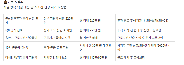 | 🍼 출산휴가 급여 상한 인상 | 210만원 → 220만원 | 휴가 시작 후1개월 이후~ 종료 후 12개월 이내 | 휴가 중 소득 안정 |