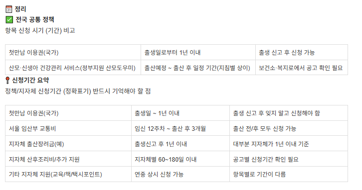 | 첫만남 이용권(국가) | 출생일 ~ 1년 이내 | 출생 신고 후 잊지 말고 신청해야 함 |