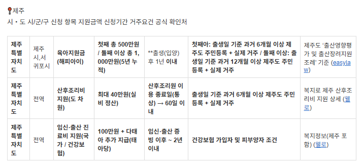 | 제주특별자치도 | 전역 | 산후조리비 지원(도 차원) | 최대 40만원(실비 정산) | 산후조리원 이용 종료일(통상) → 60일 이내 | 출생일 기준 과거 6개월 이상 제주도 주민등록 + 실제 거주 | 복지로 제주 산후조리비 지원 상세 (웰로) |