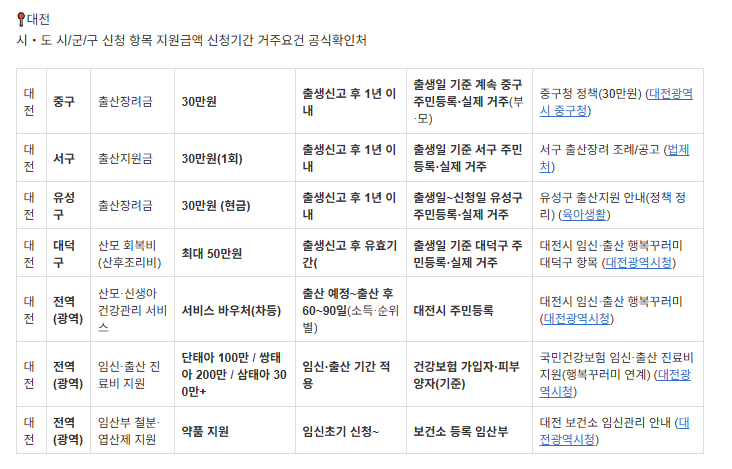 | 대전 | 중구 | 출산장려금 | 30만원 | 출생신고 후 1년 이내 | 출생일 기준 계속 중구 주민등록·실제 거주(부·모) | 중구청 정책(30만원) (대전광역시 중구청) |