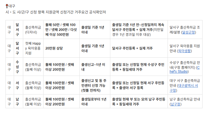 | 대구 | 남구 | 출산축하금(둘째 이상) | 둘째 100만원 / 셋째 이상 200만원 | 출생일로부터 1년 이내 | 출생일 현재 부 또는 모의 남구 주민등록 + 동일세대 거주 | 남구 출산축하금 안내 (남구청) |
