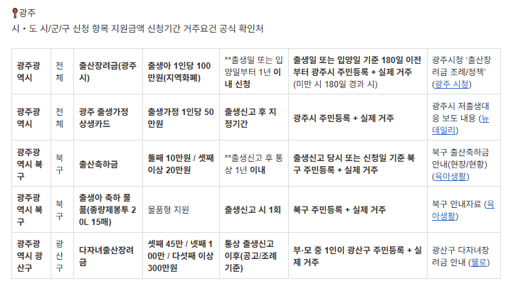 | 광주광역시 | 전체 | 출산장려금(광주시) | 출생아 1인당 100만원(지역화폐) | **출생일 또는 입양일부터 1년 이내 신청 | 출생일 또는 입양일 기준 180일 이전부터 광주시 주민등록 + 실제 거주(미만 시 180일 경과 시) | 광주시청 ‘출산장려금 조례/정책’ (광주 시청) |