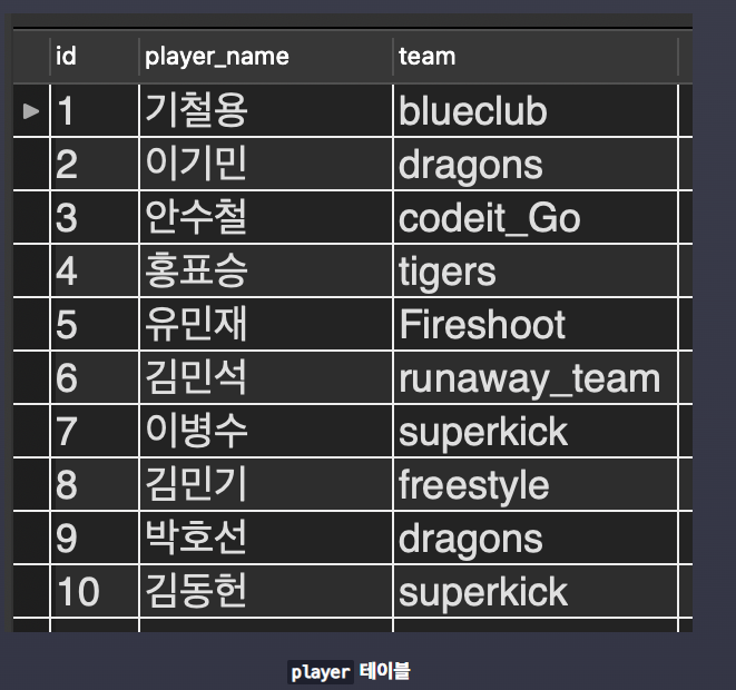 PLAYER 테이블과 TEAM 테이블이 있다.
