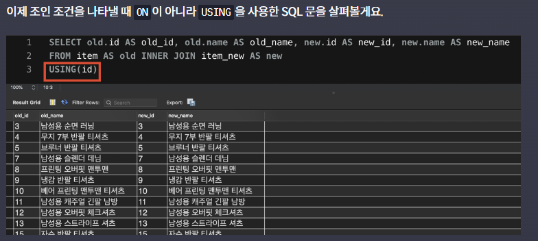 만약 조인 조건으로 쓰인 두 컬럼의 이름이 같으면 ON 대신 USING을 쓰는 경우.!!