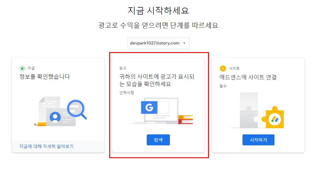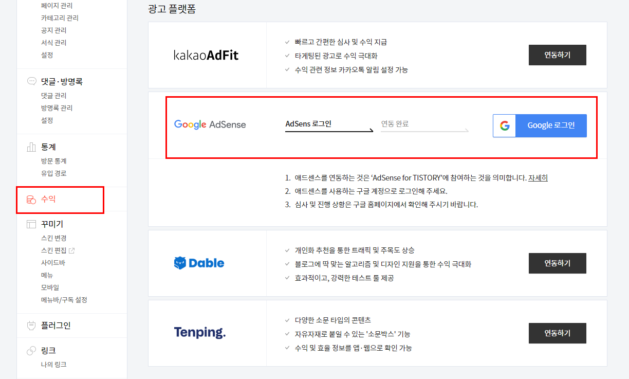 10. 본인의 티스토리 -> 수익 -> 구글애드센스 -> 구글 로그인을 통해 구글 계정과 티스토리 계정을 연동합니다.