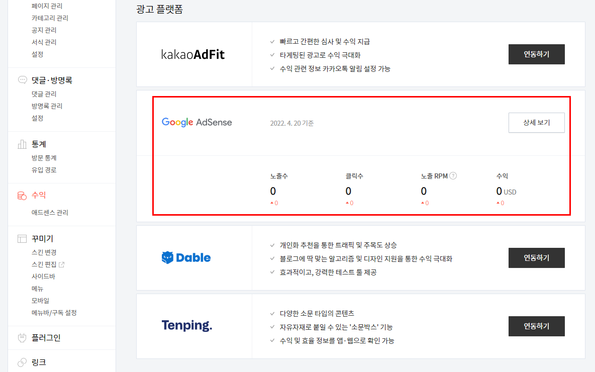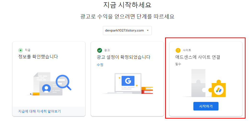 10. 본인의 티스토리 -> 수익 -> 구글애드센스 -> 구글 로그인을 통해 구글 계정과 티스토리 계정을 연동합니다.