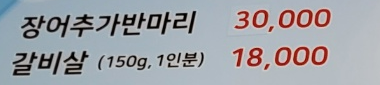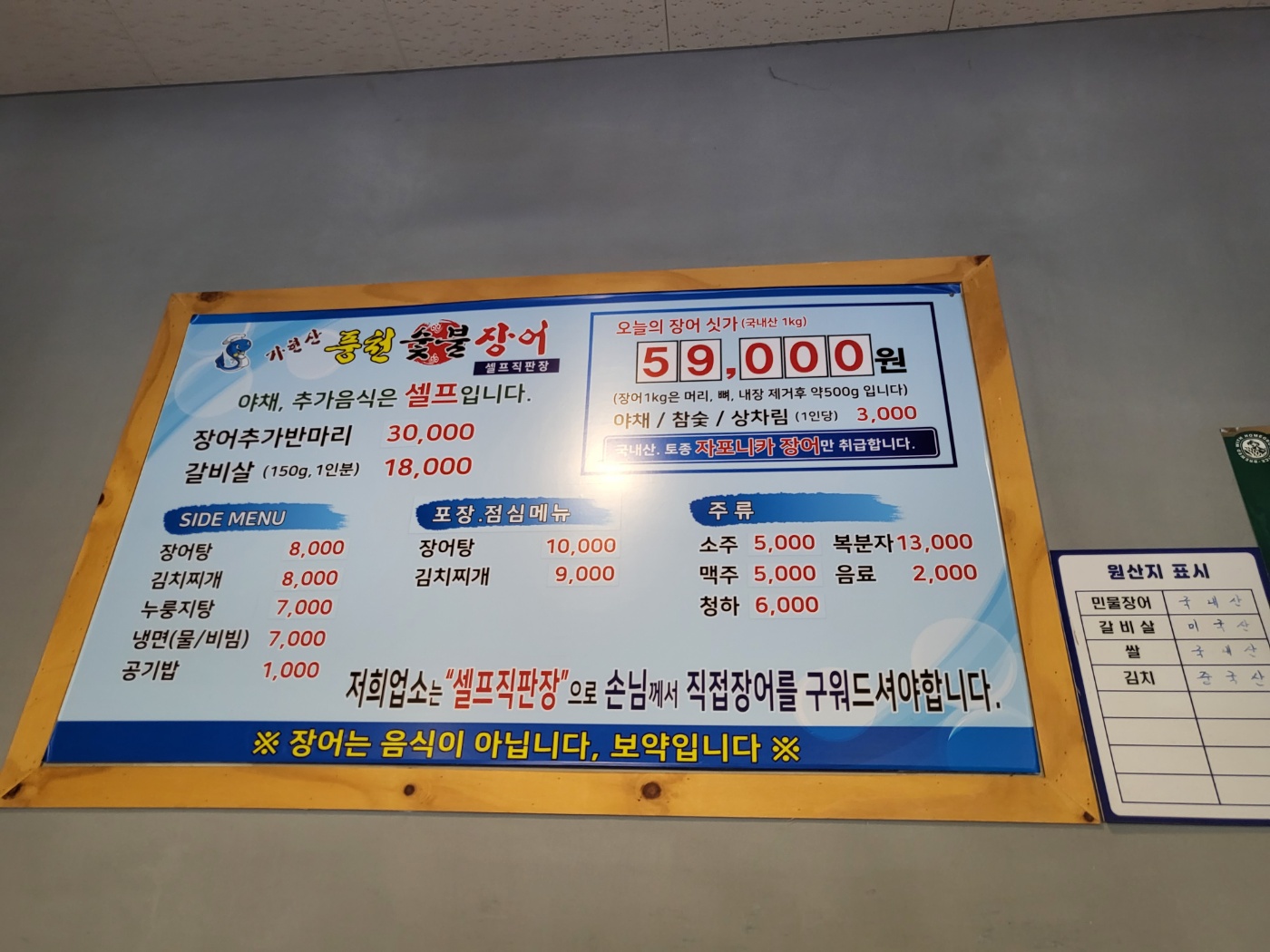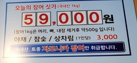 메뉴는 장어 1kg에 59,000원입니다. 장어 1kg에는 머리, 뼈, 내장을 제거 후 약 500g이 나옵니다.