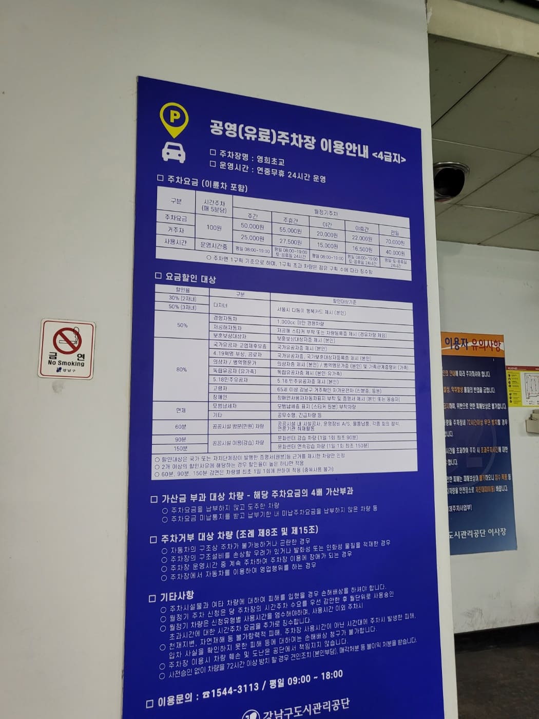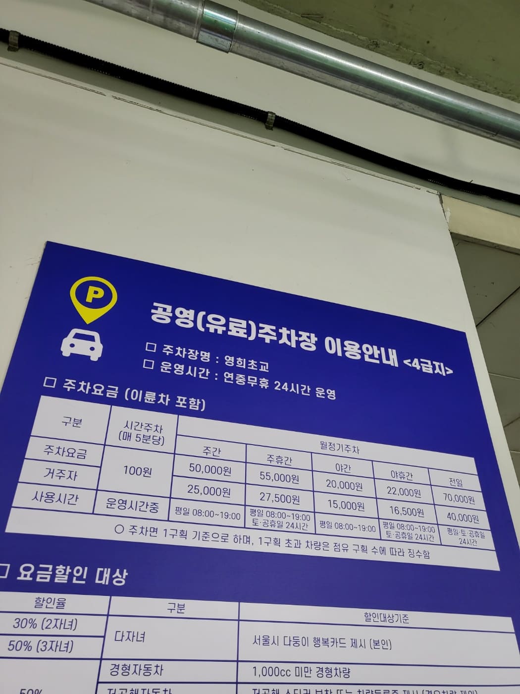 영희초등학교 주차장 비용은 위와 같습니다. 주차요금은 5분당 100원이며, 월정기주차일 경우 일반 사용자는 주간에 5만원, 주휴 간 5,5만 원, 야간 2만 원, 야휴간 2.2만 원, 전일 7만 원입니다. 대청역이나 일원동 주변 거주자는 일반 사용자에 비해 보다 저렴하게 주차장 이용이 가능합니다. 거주자는 주간에 2.5만 원, 주휴 간 2.7만 원, 야간 1.5만 원, 야휴간 1.65만 원, 전일 4만 원에 주차가 가능합니다. 넓고 쾌적하고 전기차도 충전이 가능한 주차장을 저렴하게 이용할 수 있어서 좋은 것 같습니다. 주변에 삼성서울병원도 있고, 대청역에 맛집거리도 있어서 영희초등학교 주차장을 이용하시면 돈을 많이 아낄 수 있을 것 같습니다.
