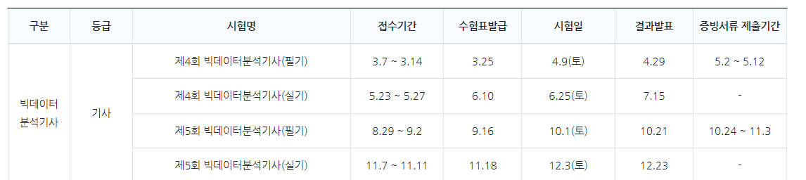 kdata 데이터 자격검정에서 시행하는 빅데이터 분석기사 2022년도 시험일정입니다.