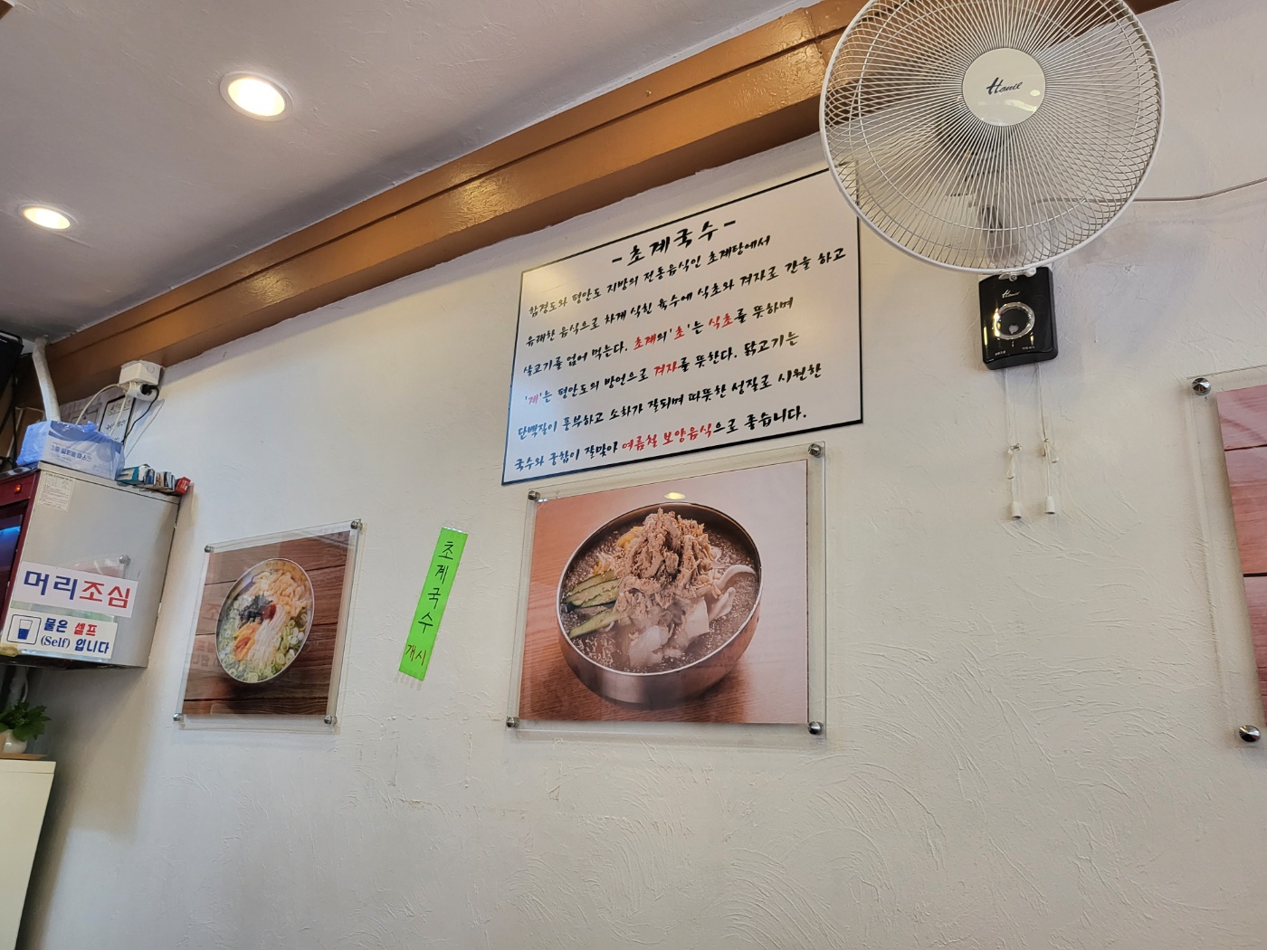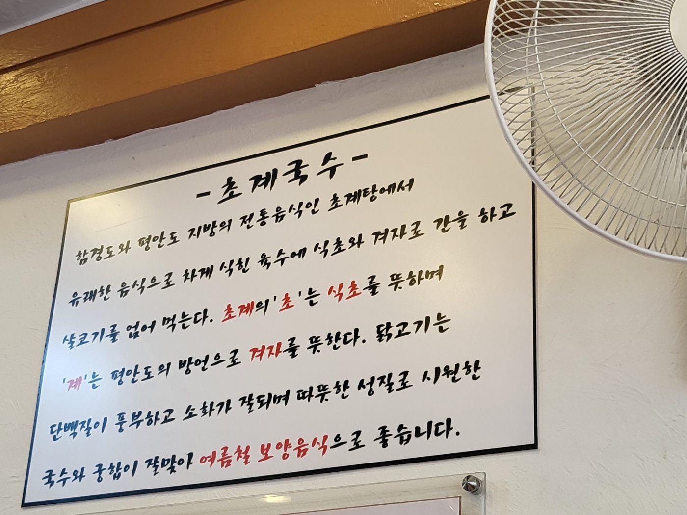 -함경도와 평안도 지방의 전통음식인 초계탕에서 유래한 음식으로 차게 식힌 육수에 식초와 겨자로 간을 하고 살코기를 얹어 먹는다. 초계의 초는 식초를 뜻하며, 계는 평안도의 방언으로 겨자를 뜻한다. 닭고기는 단백질이 풍부하고 소화가 잘되며 따뜻한 성질로 시원한 국수와 궁합이 잘 맞아 여름철 보양음식으로 좋습니다.