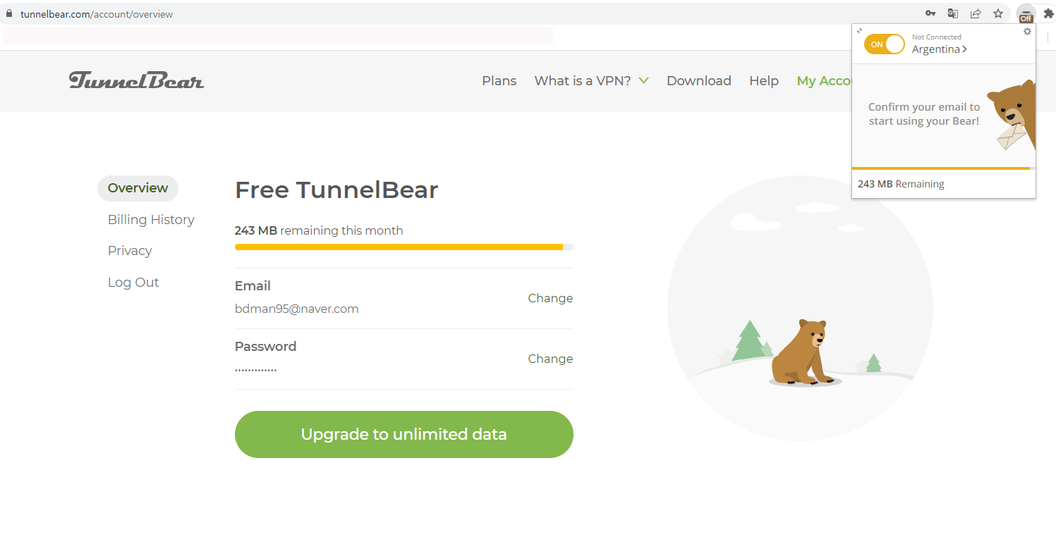 TUNNEL BEAR을 크롬에 추가 및 로그인을 해주셔야 합니다.