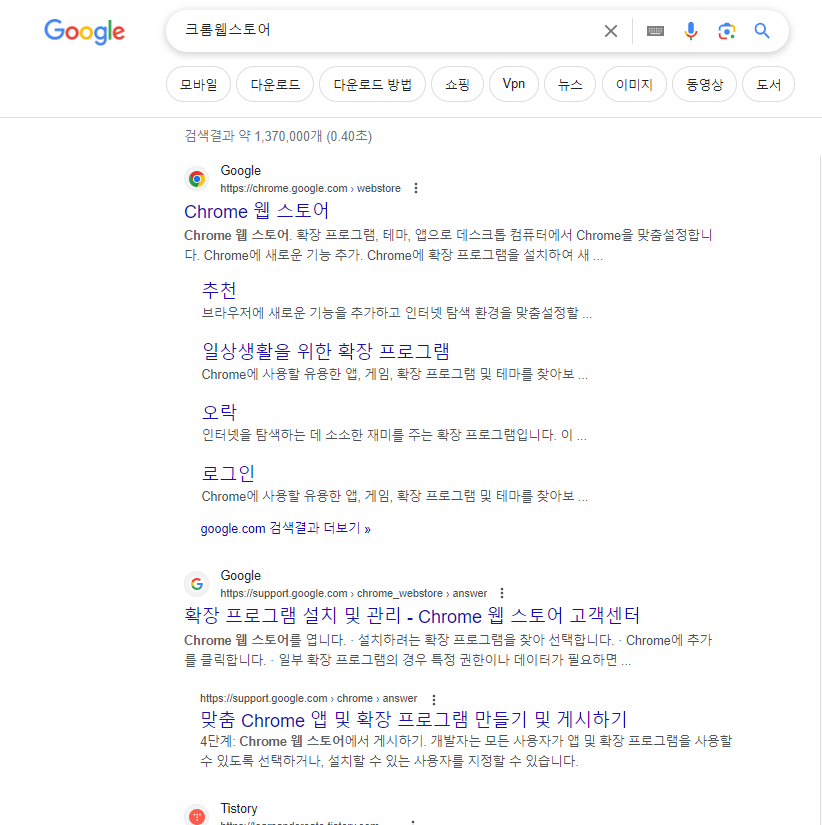 1. 구글에 크롬 웹스토어를 검색합니다.