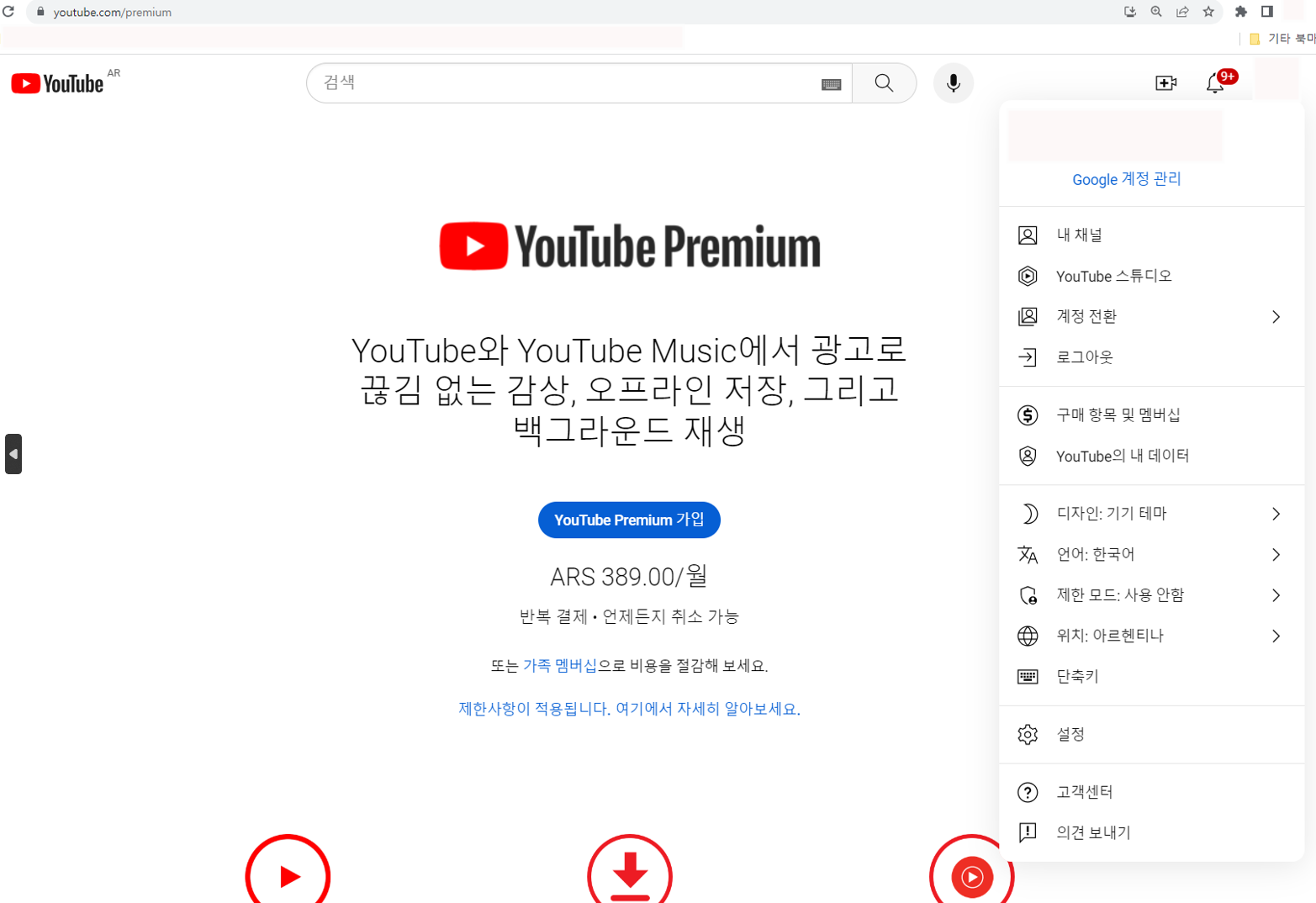 위치가 아르헨티나로 된 것을 확인하실 수 있습니다. VPN을 통해 국가를 아르헨티나로 정했기 때문입니다. VPN을 통해 해외 국가로 설정이 되었으면 유튜브에 로그인을 하여 프리미엄 결제를 진행하면 됩니다. 그러면 해당 국가로의 계속 결제가 진행이 됩니다.