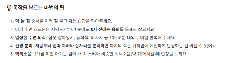 - 백일 이후: 낮 4시간 간격 / 밤 최대 7시간 (슬슬 통잠의 기운이!)