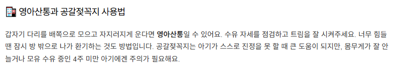 갑자기 다리를 배쪽으로 모으고 자지러지게 운다면 영아산통일 수 있어요. 수유 자세를 점검하고 트림을 잘 시켜주세요. 너무 힘들 땐 잠시 방 밖으로 나가 환기하는 것도 방법입니다. 공갈젖꼭지는 아기가 스스로 진정을 못 할 때 큰 도움이 되지만, 몸무게가 잘 안 늘거나 모유 수유 중인 4주 미만 아기에겐 주의가 필요해요.