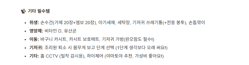 - 기타: 콧물흡입기(50일까진 미사용), 아기 오일(로션으로 충분하면 패스), 쪽쪽이(아기마다 안 물기도 함), 유모차/아기띠/이유식 용품(미리 사면 짐만 돼요. 외출 시기나 5~6개월 즈음 구매 추천!)