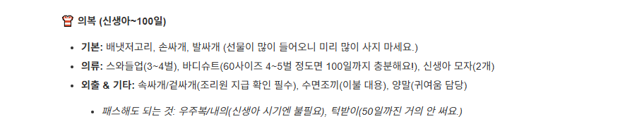 - 기본: 배냇저고리, 손싸개, 발싸개 (선물이 많이 들어오니 미리 많이 사지 마세요.)