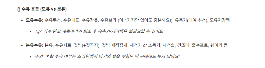 - 모유수유: 수유쿠션, 수유패드, 수유잠옷, 수유브라 (이 4가지만 있어도 충분해요!), 유축기(대여 추천), 모유저장팩