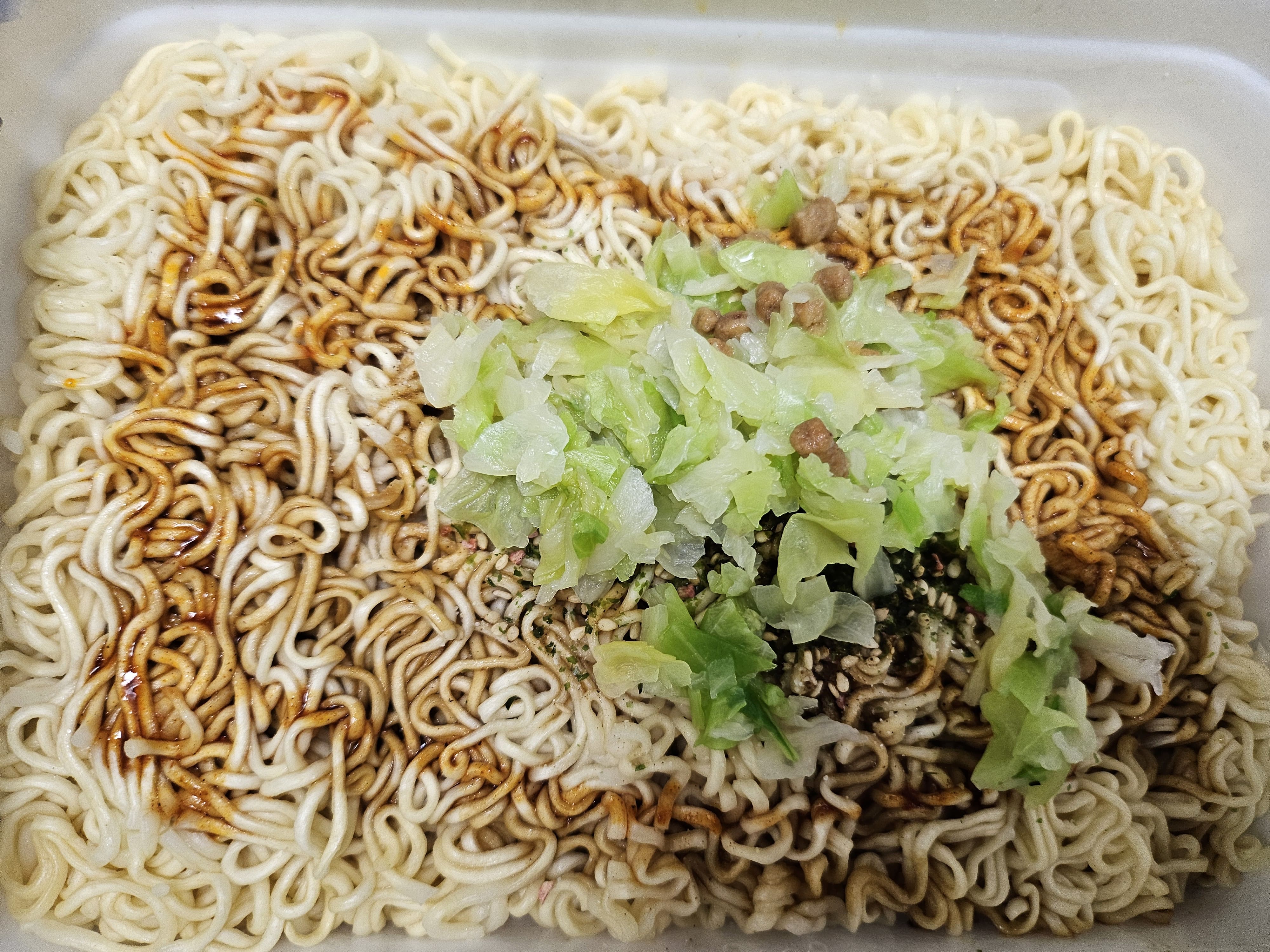 페양구 반반 야끼소바 모습입니다. 2가지의 맛을 같이 먹을 수 있는 라면으로, 보통의 라면의 양이 2배입니다.