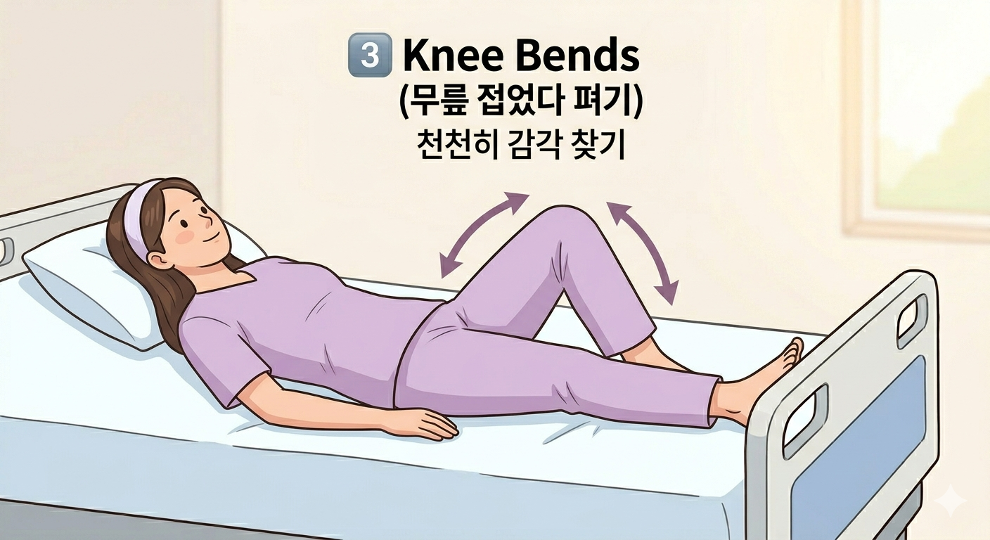 마취 기운이 남아있을 때 하체를 움직여주면 근육의 긴장을 완화하고 혈액 순환을 촉진할 수 있습니다. 이는 수술 후 발생할 수 있는 혈전을 예방하고, 다음 날 첫 걸음을 뗄 때 느껴지는 타는 듯한 통증을 줄여주는 데 결정적인 역할을 합니다.