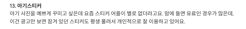 요즘 예쁜 스티커 어플 찾기 힘든데, 이건 광고만 한 번 보면 유료 스티커도 평생 무료로 쓸 수 있어서 찾은 보물 같은 어플이에요. 아기 사진 예쁘게 꾸미고 싶은 분들께 강추!