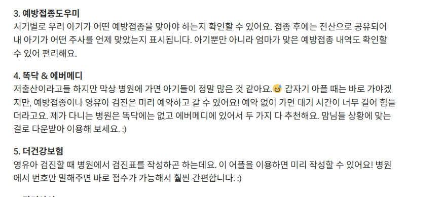 - 예방접종도우미: 우리 아기 다음 주사가 뭔지, 언제 맞았는지 한눈에 보여요. 엄마가 맞은 접종 내역도 나와서 관리하기 편하더라고요.