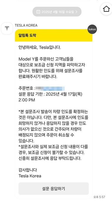 Model Y를 주문하신 고객님들을 대상으로 보조금 신청 지역을 파악하고자 합니다. 원활한 인도를 위해 설문조사를 완료해주시기 바랍니다.