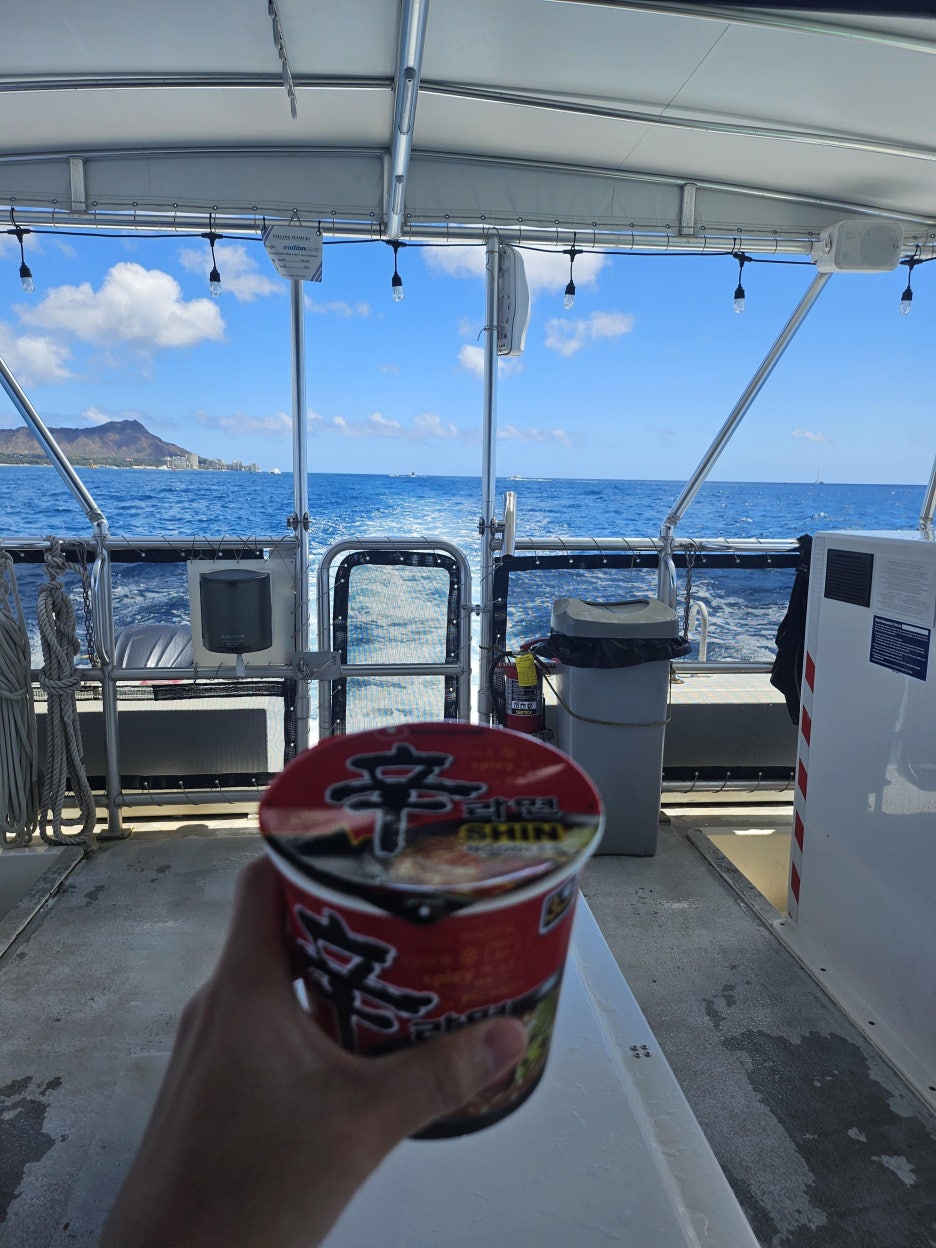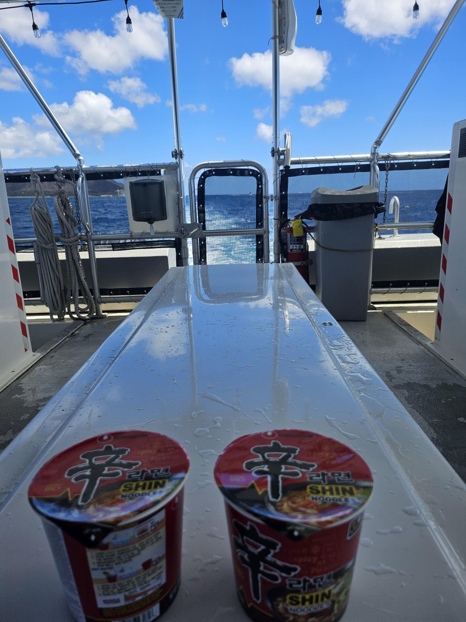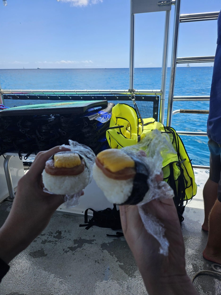 배에는 다양한 간식과 라면, 무스비가 있어서 스노쿨링하면서 배고플 때 간식을 먹을 수 있어서 좋았습니다. 다양한 초콜릿 과자도 있고 도리토스도 있고 수영 후에 먹는 무스비랑 신라면은 정말 맛있었습니다.